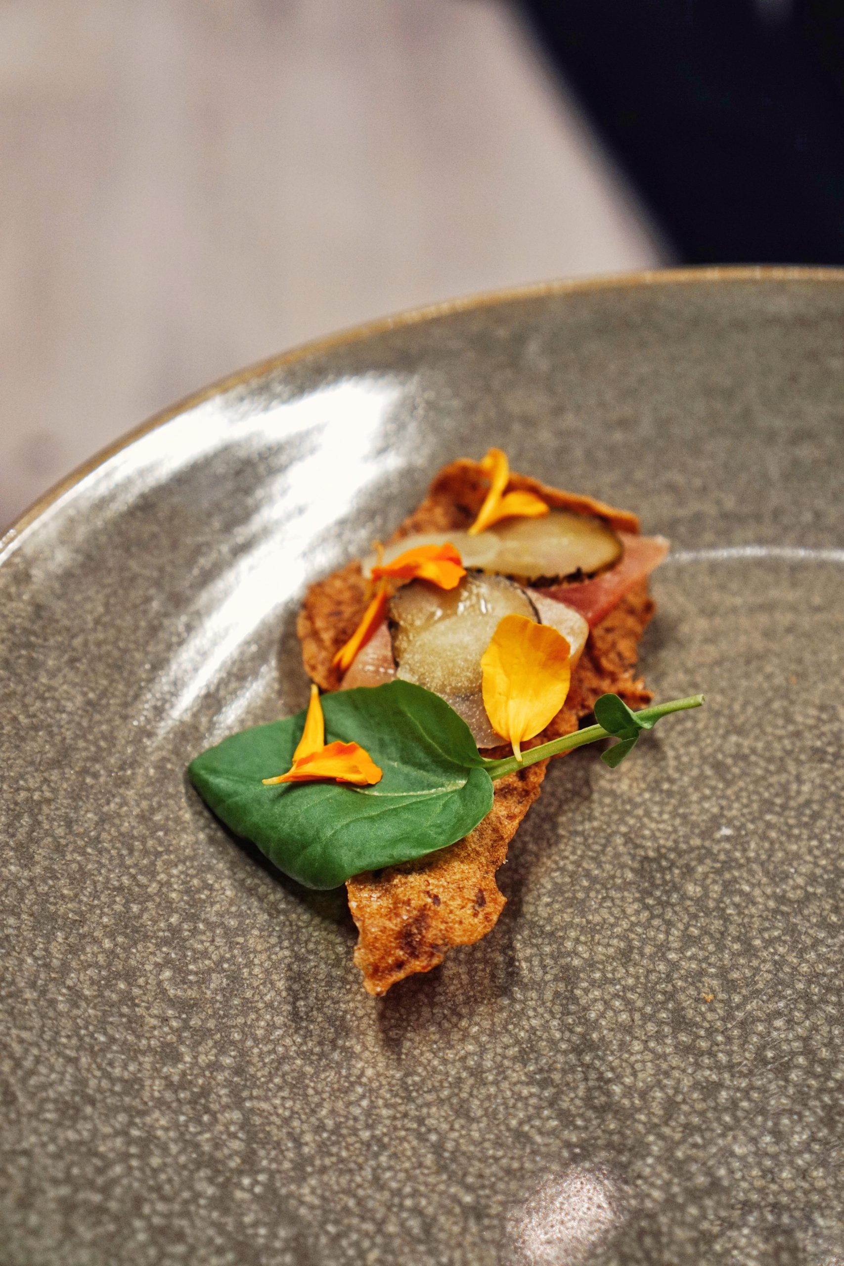 - FISH – Sake cured tuna albacore on mushroom crackers with charred and pickled cucumbers, Granny Smith