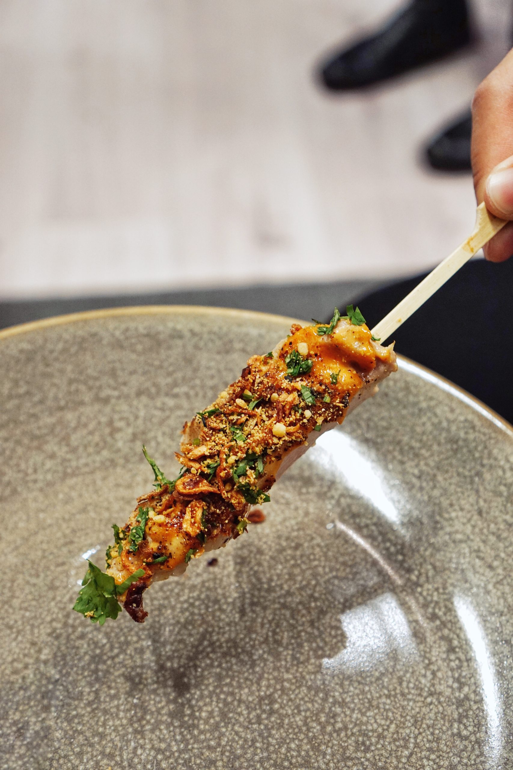 - CHICKEN – Kasu torched chicken skewers with cilantro, crispy shallots and walnut crumble